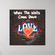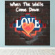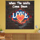 This design captures a powerful metaphor for revealing a hidden truth. It features a weathered brick wall with a jagged opening, through which a sign with the word "LOVE" is partially visible. The sign has a clean, bold style with a warm, red glow. The phrase "When The Walls Come Down" is written in a light graffiti style on the brick, symbolizing the moment we choose to reveal what has been hidden.