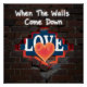 This design captures a powerful metaphor for revealing a hidden truth. It features a weathered brick wall with a jagged opening, through which a sign with the word "LOVE" is partially visible. The sign has a clean, bold style with a warm, red glow. The phrase "When The Walls Come Down" is written in a light graffiti style on the brick, symbolizing the moment we choose to reveal what has been hidden.