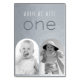 A modern, more original way to personalise your table numbers with childhood photos of bride and groom at that number age (the default is one).The placeholder photos of a little girl (the bride) and a little boy (the groom) are black and white and in the lower half. In the upper part, there is the message "when we were one" with the age written in black and the rest above, in smaller white caps (hand letters). The background is faux silver foil.