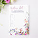 Prepare for a bridal shower challenge with our "Where Did They Go?" game! This elegant paper sheet, adorned with modern spring-summer flower illustrations in red, purple, pink, and terracotta hues, awaits your guesses. With 12 photos to decipher, put your detective skills to work and guess where the joyful couple is in each one. The person with the most correct answers wins a fabulous prize! Let the guessing games begin!