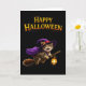 Send some perfectly magical wishes this season with our magical witch kitten soaring greeting card this adorable design features a cheerful tabby kitten dressed in a purple witches hat and Cape flying through the night on a broomstick with a glowing lantern set against a clean deep black background with bold vintage style Halloween lettering this card captures the sweet and whimsical side of the holiday. It's the ideal choice for cat lovers's children or anyone who enjoys a touch of charm with their spooky celebrations high quality and ready for your personal message. This card is a heartwarming way to say happy Halloween
