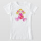 Whimsical girls rag doll painted t-shirt, ideal for a little girl. Cute pink, red, purple, yellow and white colours tee print. Personalise with your own girls short name on the red heart pillow the rag doll is holding, currently reads Elouise. Reproduced from a original watercolor painting by Sarah Trett.