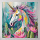 A modern abstract painting featuring a whimsical unicorn surrounded by pastel-coloured cacti and succulents. The unicorn, painted in flowing lines and vibrant colours, stands out against the soft tones of blush pinks, mint greens, and pale blues in the desert plants. This playful, imaginative composition combines the mystical aura of the unicorn with the organic beauty of desert flora, creating a dreamy, magical scene with a contemporary artistic touch.