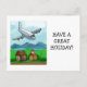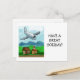 Take flight with this enchanting postcard featuring a charming hand-drawn aeroplane soaring gracefully over a serene landscape. Soft, muted colour shading brings this delightful scene to life, showcasing majestic mountains, cosy houses nestled amongst lush greenery, and a boundless blue sky dotted with fluffy clouds.
