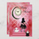Pink Baby Shower invites for girls - Whimsical, cute and beautiful, surreal Alice in Wonderland pink Baby Shower invitations with a pretty black vintage silhouette of Alice carrying an elegant pink flamingo. She is stood at the top of a pink staircase next to a gold crescent moon ornament with a clock hanging from it. Written on the clock is "I'm late I'm late for a very important date" Also on the staircase is a pretty white teapot and a white rabbit in a black mad hatter's top hat. On the reverse of the invites is a white beautiful lace and pearls mat with pink roses for you to personalise with your shower details. Stylish, modern, chic, glamourous fantasy art Baby Shower invitations. If you need any assistance customising your product please contact me through my store and I will be happy to help. Pearls and lace mat on reverse of invites by ©Hazel Kinvig-Paul www.design-a-dream.co.uk Please note: All invitations on Zazzle have flat printed images.