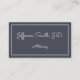 This basic and whimsical business card design features a dark grey background, and a double-line white border. It could be used by a legal professional such as a attorney, public notary, paralegal or lawyer. The name, profession and contact details can be personalised.
