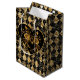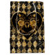 A whimsical and romantic goth design to turn an ordinary pillow into a Valentine featuring an elegant heart with golden roses on a dramatic black and gold harlequin pattern background.
