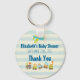 A cute thank you keychain for a baby shower. Designed with cute children's themed nursery art illustrations of a little doggy riding in an aeroplane and a toy train filled with whimsical animals. A bright orange doodle sun shines overhead. Set on a cream and blue striped background.