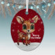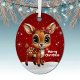 Whimsical Baby Deer Snowy Christmas Berry Red Ornament. Featuring an adorable cartoon graphic of a cute fawn standing on snow-covered ground, with a light sprinkle of sparkles that mimic gently falling snow against a vibrant berry red background. Tucked behind its ear are delicate poinsettia flowers, evoking a winter woodland wonderland perfect for the festive season. This personalizable Xmas floral fawn decoration is ideal for hanging on your Xmas tree or as tags for presents, bringing joy to every corner of your home. This cute two-sided illustration can be easily customized by adding your personal messages or names to either side! Makes a cherished keepsake for years to come. This lovely custom doe lover decor will make a wonderful gift for every member of your family! Customize by changing the white "Merry Christmas" text, font, color, or delete it entirely. You can even transfer this design onto other products for endless creativity.