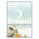 Pure whimsy, this beachy table number has a relaxed, coastal vibe incorporating elements such as distressed wood, plumeria and other beach-inspired motifs. The muted colour palette includes shades of blue, green, and sandy beige, reminiscent of the ocean and the beach. The overall design is fun and romantic, making it perfect for a coastal inspired wedding.