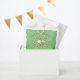 Whimsical baby shower favour bags feature a cute bee and flower wreath with customisable text on green background.