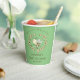 Whimsical baby shower themed paper cups features cute bee and flower wreath with customisable text on green background.