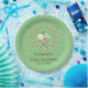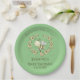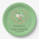 Whimsical baby shower paper plates feature a cute bee and flower wreath with customisable text on green background.