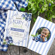Centre: Party details elegantly wrapped in delicate blue floral laurel leaves