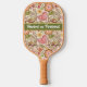 This pretty tan pickleball paddle has a whimsical pattern of folk art type flowers, birds, hearts, branches, and foliage in warm earth-tones of tan, peach, burgundy, green, yellow, orange, and pink with white customisable lettering on the front and back on top of a green and yellow band across the paddle. The front side says, "Hooked on Pickleball" and the back says, "Paddle Pro" next to a green pickleball that you can remove if you prefer. You can change either side to say whatever you want them to. Email niteowlstudio@gmail.com with any request for changes.