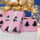 A pattern of black Christmas trees appears on this light pink wrapping paper.