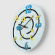 Whimsical wall clock done in a turquoise blue and white polka dot background, with a dial face that is a black spiral with turquoise blue and yellow numbers. Great gift idea for anyone.