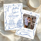Blue line hand drawn wedding invitation featuring a champagne bottle, wedding cake, glass, grapes and more. The couples photo appears on the back of the invitation.