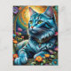 A quirky blue cat surrounded by vibrant flowers in a whimsical and colourful painting.