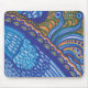 Whimsical mousepad with a unique abstract design that resembles feathers and lace. Funky work of art with bright sky blue, royal blue, tangerine orange, and green.