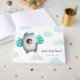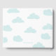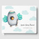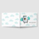 Cute baby shower guest book with a little bird in its spaceship going through the blue baby clouds. Personalised the text with your own information. Illustrated and designed by Patricia Alvarez.