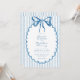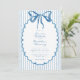 This whimsical invitation features a soft blue watercolor bow and a playful scalloped oval frame against a classic blue and white striped background. Perfect for a wedding with a preppy or coastal aesthetic, this charming design provides a sweet, hand-painted look for your special celebration. Created by Simply Farmhouse Press.