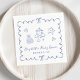 Cute napkins for your baby boy shower featuring a french blue wavy frame adorned with bows, whimsical hand-drawn illustrations of hearts, stars, cake and nursery decor, and the name of the mother-to-be showcased in a playful blue script.