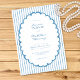 This whimsical invitation features a soft blue, playful scalloped oval frame against a classic blue and white striped background. Perfect for a wedding with a preppy or coastal aesthetic, this charming design provides a sweet, hand-painted look for your special celebration. Created by Simply Farmhouse Press.