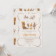 Whimsical women's birthday invitation featuring a cowgirl boot, bottle, glass and cactus in brown and orange. This birthday invitation also features a quirky frame with hearts and retro stars.