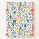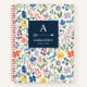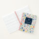 Charming floral notebook with flowers, greenery, and berries in yellow, coral, blue, and pink. Add your initial and name separated by an arrow divider on a navy blue label.