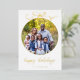 A modern holiday card with your favourite photo in the centre of gold foil circle ornament shape topped with a foil whimsical hand drawn bow, on an white background. The editable "happy holidays" greeting is in gold cursive font. Sign off with your name in sans serif font.