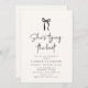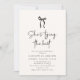 A whimsical and modern bridal shower invitation featuring a playful bow illustration and elegant script font with the phrase “She’s tying the knot.” The minimalist black and white design creates a chic and timeless aesthetic, perfect for celebrating the bride-to-be in style. Ideal for those who love a modern yet romantic look.