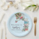 Whimsical bridal shower tea party plates feature watercolor illustration of stacked floral teapot and teacups on light blue background.