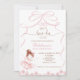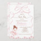 Sweet tutu or ballerina themed 2nd birthday invitation for a girl featuring a cute bun brown hair ballerina and whimsical style bow and heart frame. This two tu cute second birthday invitation also features some pink daisies and a bow pattern on the back .