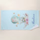 A beach towel wwith a charming illustration of a little bunny riding along in a hot-air balloon decorated with a fancy pink ribbon, along with some flowers and butterflies. A pastel blue background gives it a vintage dreamy feel.