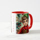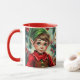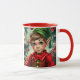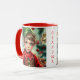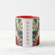 A sweet Christmas coffee mugs that can be personalized with a cute elf cartoon and a festive background.