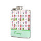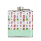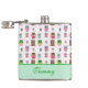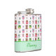 Fun lady's drinking flask, with cute cartoon graphics of colourful pink, green, and brown owls and polka dots, on a white background. A mint green band, across the bottom, has green text ready to personalise. Cute gift idea.