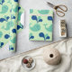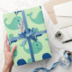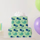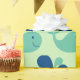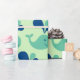 A whimsical birthday wrapping paper for kids, featuring a playful, spouting whale. The whale is a vibrant mix of green and blue tones, with a smooth, rounded body and a cheerful expression. Water sprays from its blowhole in curved, cartoonish droplets, adding a fun, dynamic element to the design.