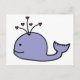 This cute postcard features a cartoon drawing of a whale, blowing red hearts out of his blow hole. Whimsical and sweet.