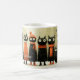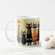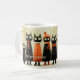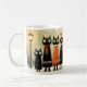 Mug featuring a whimsical painting of a row of cats in winter outfit. On the left is a lantern and on the right a Christmas tree.
