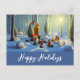 Fun Holiday postcard features whimsical and surreal Christmas forest scene with snow capped trees, created with AI generating software. "Happy Holidays" text on blue background is customisable.