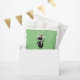 Whimsical modern hand illustrated standing moose with santa hat, scarf, and customisable Merry Christmas text on green background
