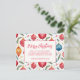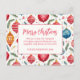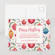 Bring a smile to the faces of your friends and relatives when they receive your Christmas postcard with this whimsical ornaments design and "Merry Christmas" greeting. The pattern is very cute with bright, cheery holiday colours of red, blue, and yellow in vintage watercolor. Bits of Yuletide ephemera and wisps of pine tree boughs are additional decorative accents. All the text, which is in red typography, can be edited. Be sure to change the example family name and year to the ones you want.