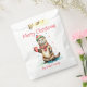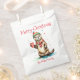 This delightful Christmas favour bag features an adorable otter standing upright, dressed in a festive red and green striped hat with a fluffy pom-pom and a cosy red scarf with white fringe. The otter holds a red cup adorned with a white snowflake design, filled with a whipped cream-topped beverage. Above the otter, the greeting “Merry Christmas” is displayed in bold, stylised lettering against a clean, white background. The text is fully customisable, allowing you to personalise the message to suit any sentiment. Soft watercolor splashes in blues and greens add an artistic touch to the background, creating a warm and inviting holiday scene perfect for sending season’s greetings.