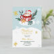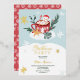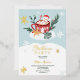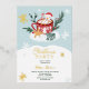 A modern, cute and whimsical Christmas party invitation illustration with a cute floating snowman in a hot cup of chocolate holding a red and white candy cane with a white and red Christmas trees and snow on the cup with a blue cute wrapped gift on a pile of snow with a beige cookie gold star. A traditional red and green Christmas party invite with a playful brushed script font.