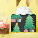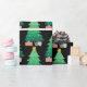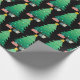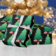 This Christmas gift wrapping paper features a whimsical and festive graphic of a decorated Christmas tree accented with gifts. The background is black to give a bold contrast.