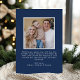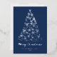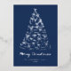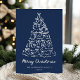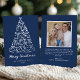 Celebrate the holidays with this Christmas photo card featuring a whimsical hand-drawn Christmas tree with radiant silver foil bows on a rich navy background. “Merry Christmas” is shown in coordinating foil script, with your family name and year printed below. The reverse side features a square photo and holiday message, offering a sophisticated and modern option for holiday greetings.