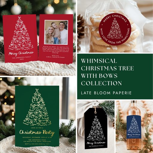 Send festive greetings with this Christmas photo card featuring a whimsical hand-drawn white Christmas tree with bows on a classic navy background. “Merry Christmas” is written in handwritten white script with your family name below. A vertical family photo completes the design on the right, giving it a clean and modern layout. The back includes a matching bow illustration above your holiday message, creating a timeless and sophisticated Christmas card.