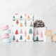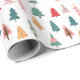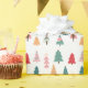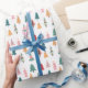 Festive Christmas wrapping paper, with a whimsical pattern of colourful trees.