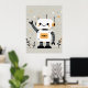 Amidst a whimsical backdrop, a friendly robot waves cheerfully, its white body and head adorned with orange circular ears and expressive black eyes. The playful style, scattered stars, and small plants create a delightful scene that appeals to both children and adults, adding a touch of futuristic charm and warmth to any nursery.